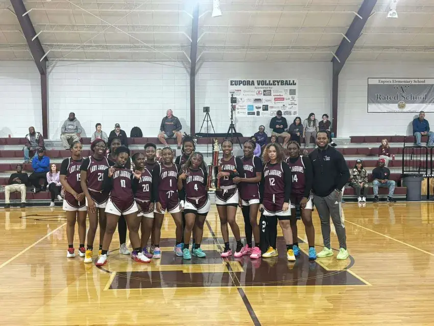 The J.Z. George girls brought home a winner’s trophy from the tournament at Eupora High School last Saturday. Members of the team are, from left, Cirena Reed, An’necieyunna Fleming, Kyleigh Sibley, Ja’Narri Pointer, Alaysha Bouldon, Madison Kyles, Kyndale Edwards, Katelyn Rice, Tysalyn Meeks, Kiyunna Ward, Jamiya Leahman, Alayah Herndon, Dakiya Robinson and head coach Jaquell Davis.