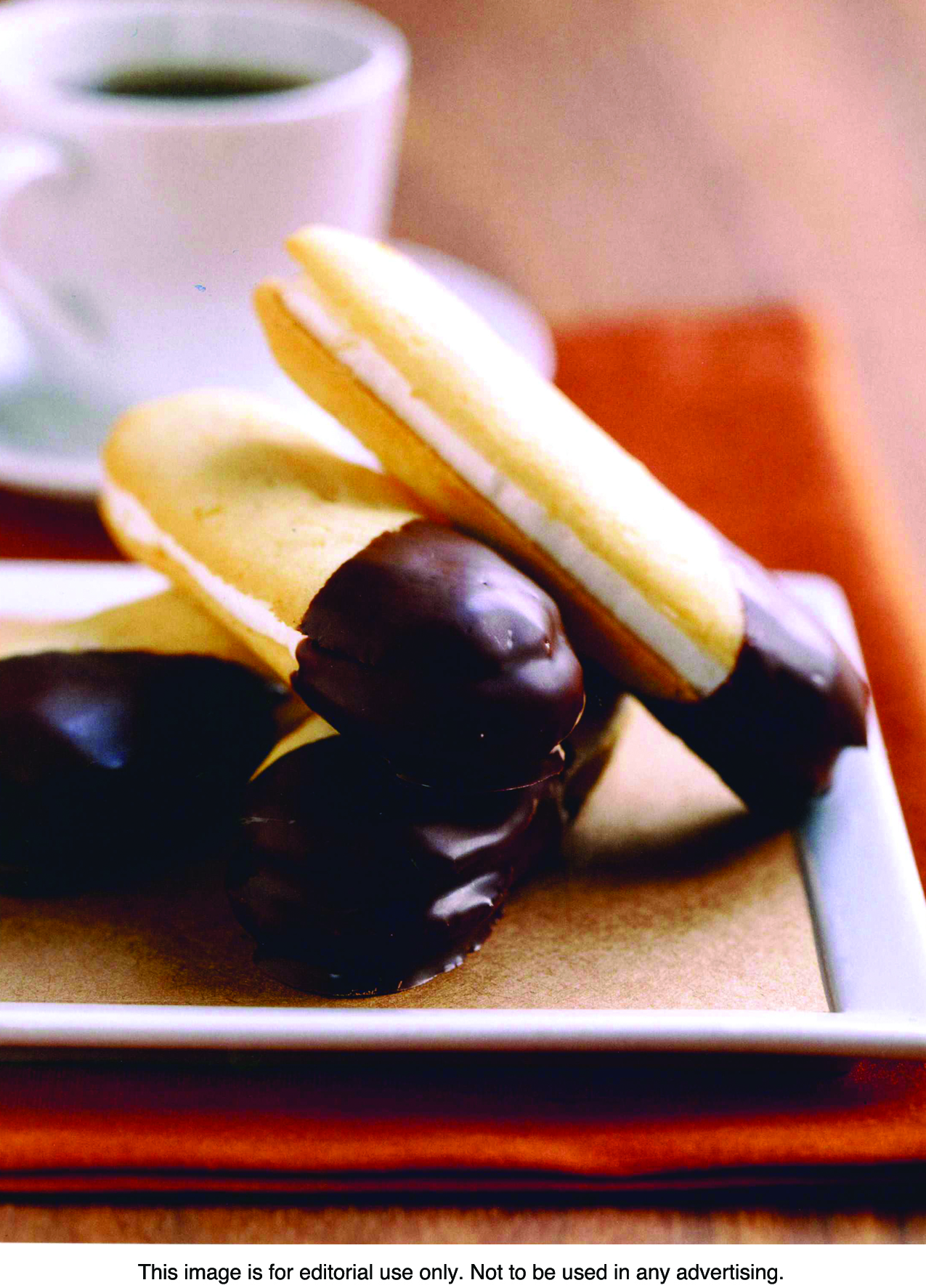 While the cookies are in the refrigerator, melt the chocolate in the top of a double boiler set over simmering water, stirring until smooth. Remove the inset and cool the chocolate to room temperature. Remove the cookies from the refrigerator. Holding each cookie by one end, dip half of it in the melted chocolate. Set it on a waxed paper- or parchment-lined tray. When all of the cookies are dipped, return them to the refrigerator for a few minutes to set.