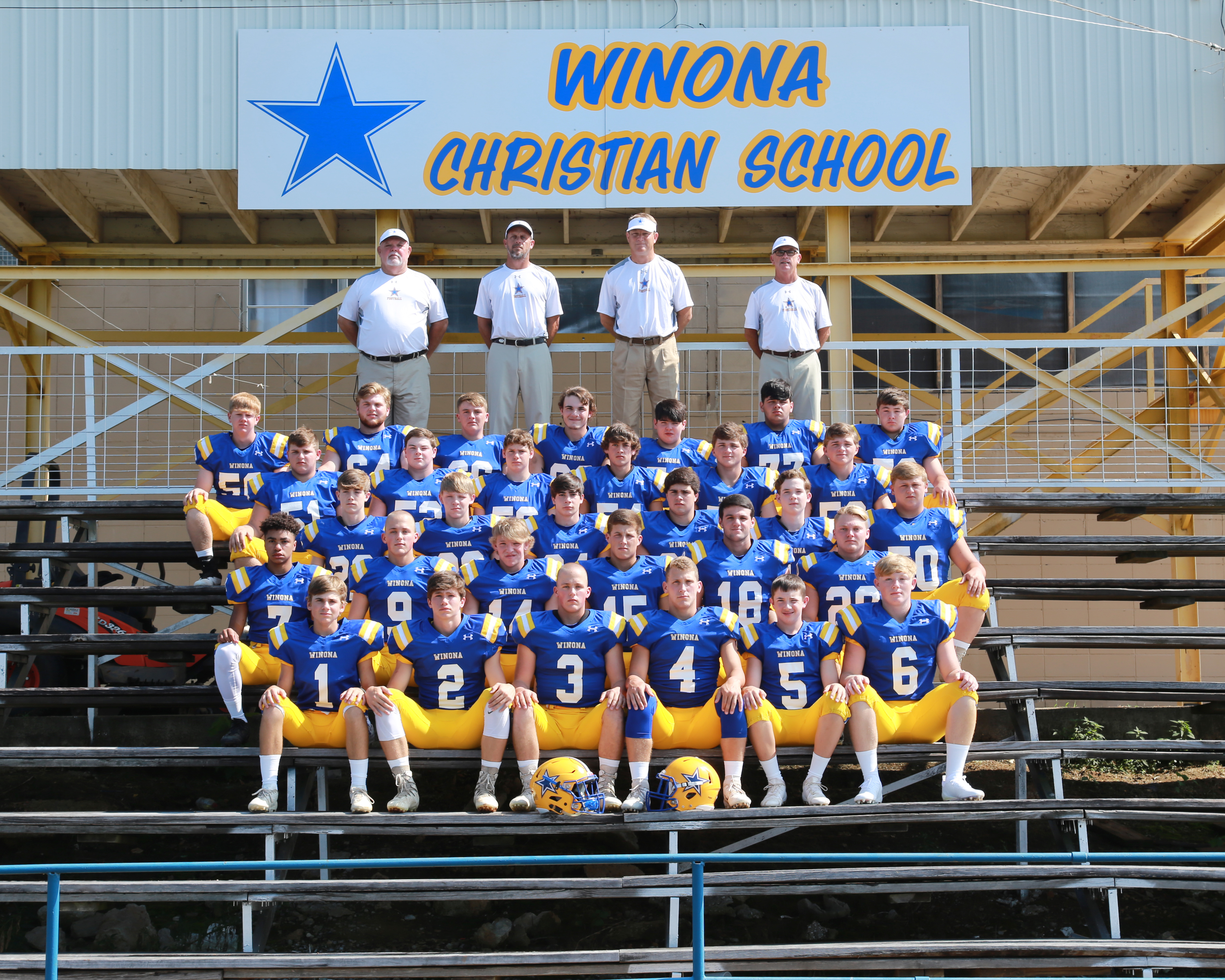 The Winona Christian Stars are this year’s district champions for Mississippi Association of Independent Schools Division 1-AA with a 34-21 win over the Carroll Academy Rebels last Friday night. The 2018 Stars football team includes (front, left to right) Ty Evans, Choyce Diffey, Colby Marlow, Blake Marlow, Logan Graham, Hayden Self, (second row) Dalton Wiggins, Cade Marlow, Ben Pinkard, Latham Hill, Thomas Costilow, Corley Goss, (third row) Lane Beckwith, Bradley Pinkard, Kyle Nabors, Holland Ingram, Steele Mims, Jake Tompkins, (fourth row) Reece Oliver, Johnathan Blaylock, Hunter McMullin, J. P. McCaleb, Jake Sutton, Noah Sutton, (fifth row) James Holder, Parker Jenkins, Collin Mullins, Seth Sykes, Hunter Smith, Christian Smith, and Landon Wilson. Not pictured are David Mason Bock, John White, and Connor Nail. Coaches are Lee Burrell, Bill Defenbaugh, Shannon Self, and Head Coach Junior Graham, atheletic director.