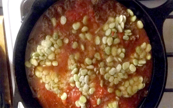 Brown hamburger meat and drain any grease. Usually, all of the veggies come from the summer garden and canned or frozen just after picking. When that can’t happen, I improvise. Add the tomato juice and the frozen limas, and cook on the stovetop for 20 minutes, then add frozen corn and cook for a final 10 minutes. I like to prepare this soup in the cast iron pan I cook the hamburger meat in. To me, it adds an extra layer of flavor.