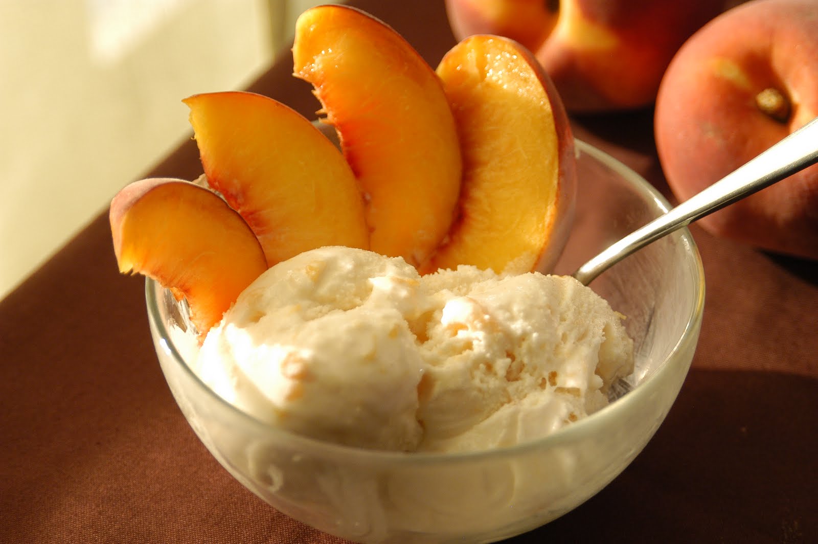 To turn Mother’s homemade vanilla ice cream into fresh peach ice cream. Core and chop 4-5 fresh peaches. Pour ½ cup or 1 cup of sugar over the peaches and let sit for one hour before adding to the ice cream mixture.
