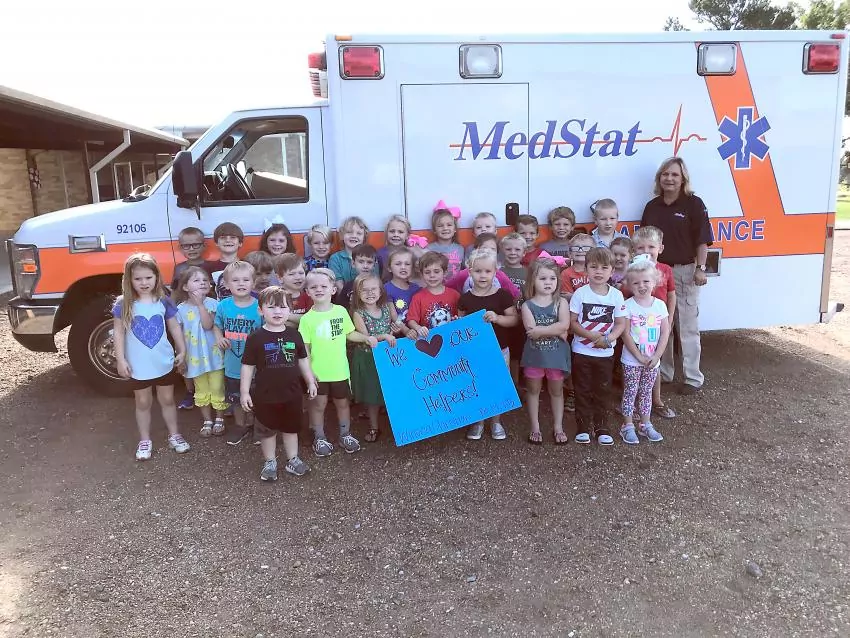 The Kindergarten classes – 2K, 3K, 4K, and 5K -- at Winona Christian School welcomed paramedics from MedStat Tuesday as part of the school’s “We Love Our Community Helpers” program. Pictured are (front, left to right) Hayes Cook, Cam Harris, Charlie Kate Nurqust, Ava Johnson, Asher Sproles, Keathley King, Lillian Devine, Paxon James, Marle