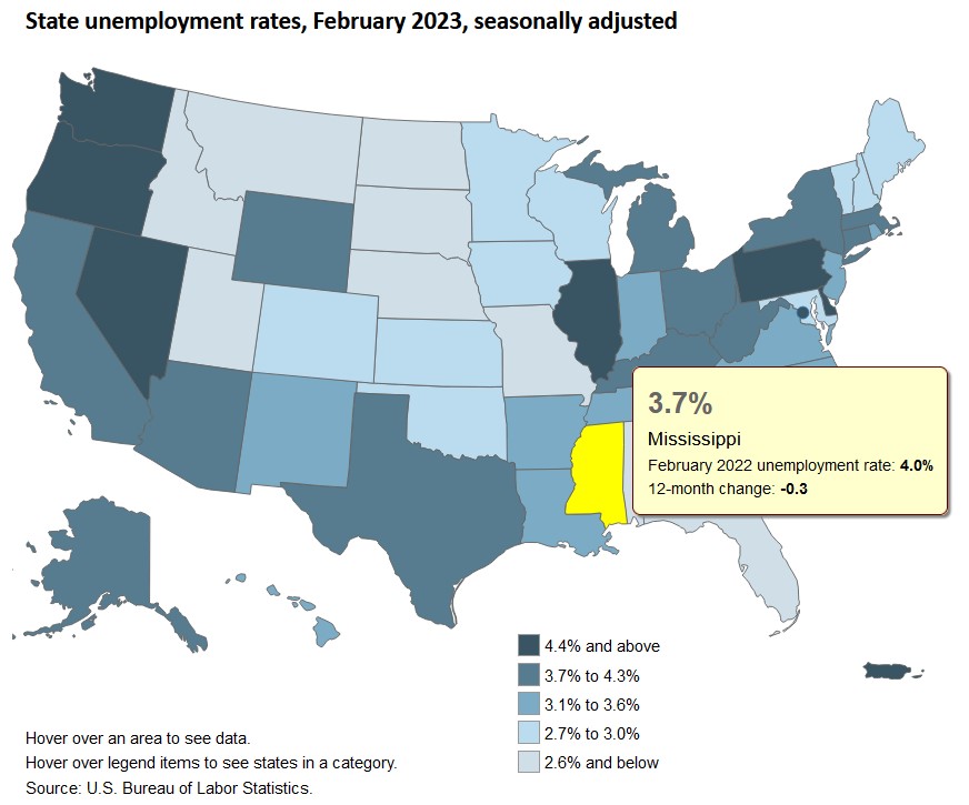 The current unemployment rate for Mississippi (as of February 2023) stands at 3.7 percent.
