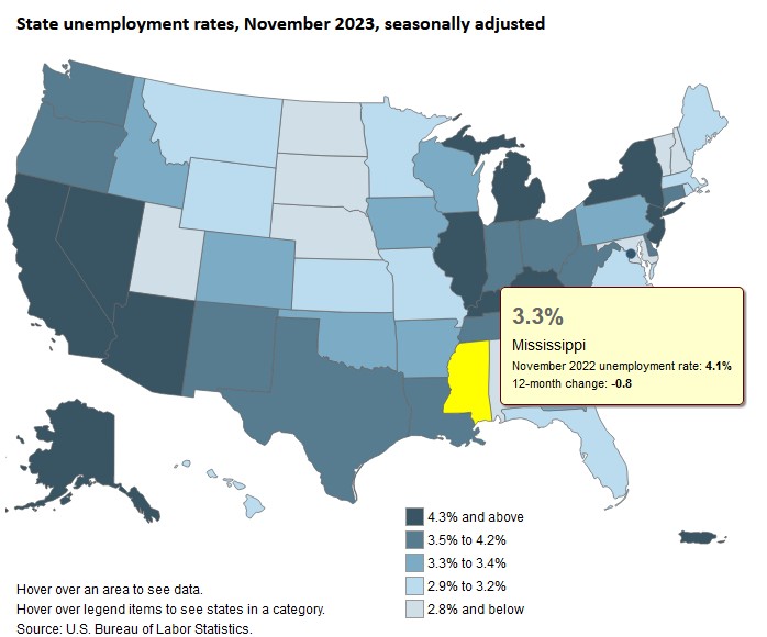 The current unemployment rate for Mississippi (as of November 2023) stands at 3.3 percent.