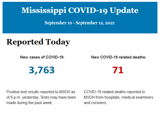 * New COVID-19 positive test results reported to MSDH for the three-day period September 10 through September 12 as of 3 p.m. yesterday *