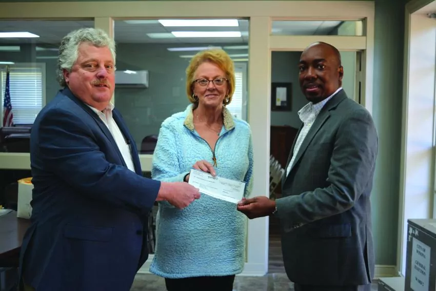 Tice White, director of public affairs for Walmart in Mississippi, traveled Monday to Winona from Jackson to hand-deliver a check to Mayor Jerry Flowers and Sue Stidham, Winona Main Street director.