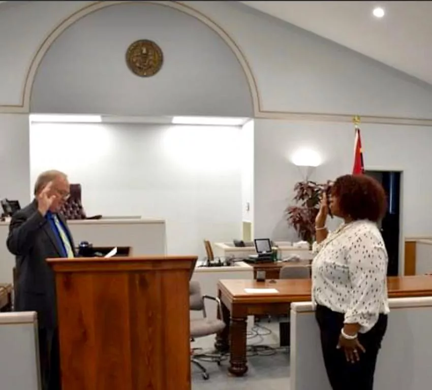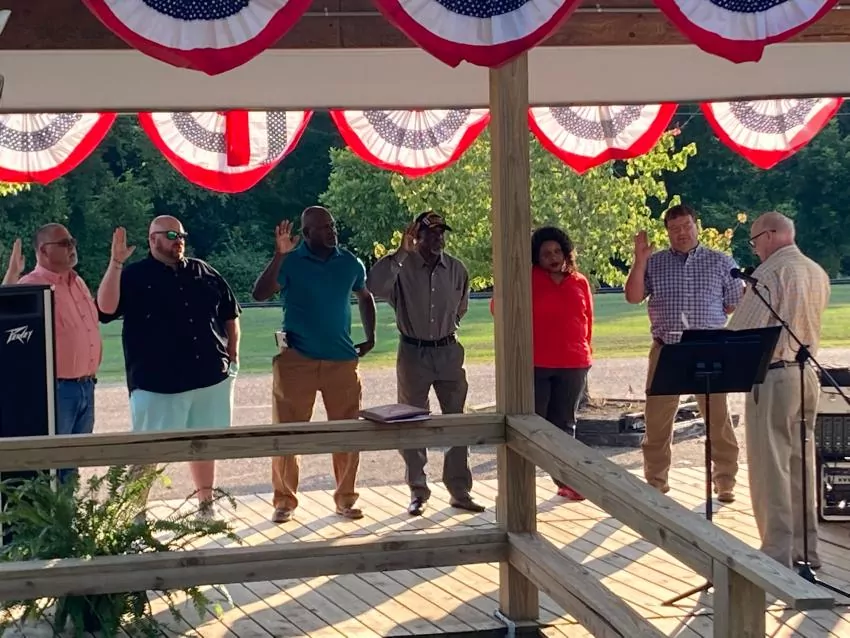 City Attorney Lane Greenlee administers the oath of office to the Kilmichael Mayor and Board of Aldermen Saturday during the town’s Independence Day celebration. Pictured (from left) are Alderman Marcus Lawson, Alderman Clay Eldridge, Alderman Bernard Daniels, Alderman Earnest Curtis, Alderwoman Wilma Carodine, and Mayor Bryan Lott.