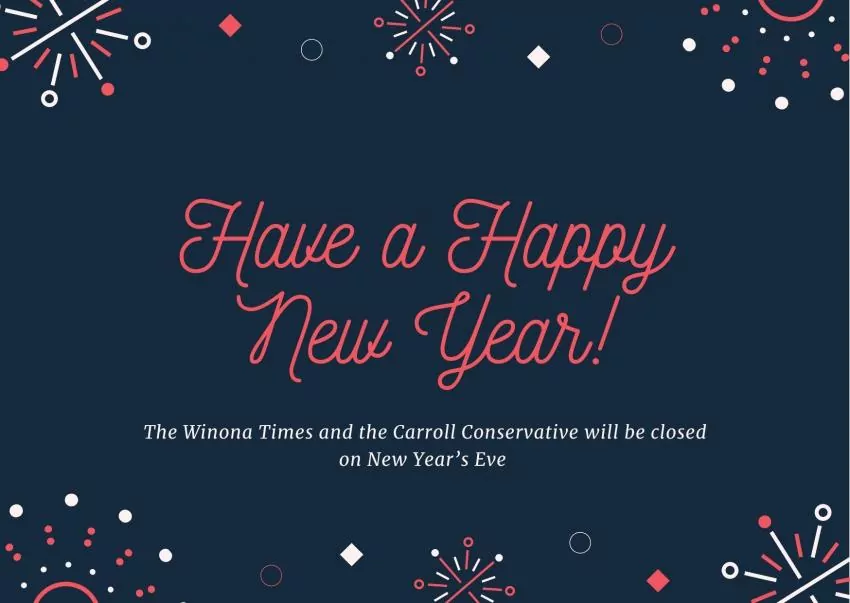 The Winona Times and the Carroll County Conservative will be closed Friday, December 31, 2021. Our office will reopen at 8 a.m. on Monday, January 3, 2022. We hope you have a great New Year's celebration, stay safe, and we'll see you all bright and early in 2022!