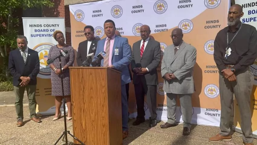 Marshand Crisler, center, executive director of the Hinds County youth detention center, celebrates with county officials Monday, Oct. 31, 2022, the news that the Henley-Young facility is free of federal oversight after decades under a court order because of unconstitutional conditions. Mina Corpuz/Mississippi Today Credit: Mina Corpuz / Mississippi Today