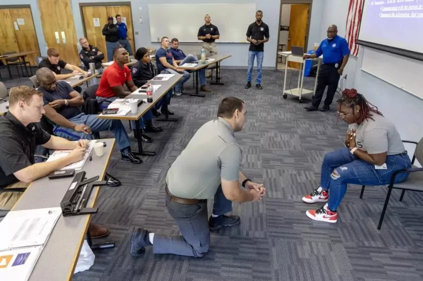 Mississippi Highway Patrol Trooper Sy Holley, center, and Latesha Wells, case manager with Hinds Behavioral's Mobile Crisis Response Team, right, participate in a psychiatric call simulation during a training session at the Mississippi Law Enforcement Officers Training Academy in Pearl, Miss., Friday, July 30, 2023. Credit: Eric Shelton/Mississippi Today
