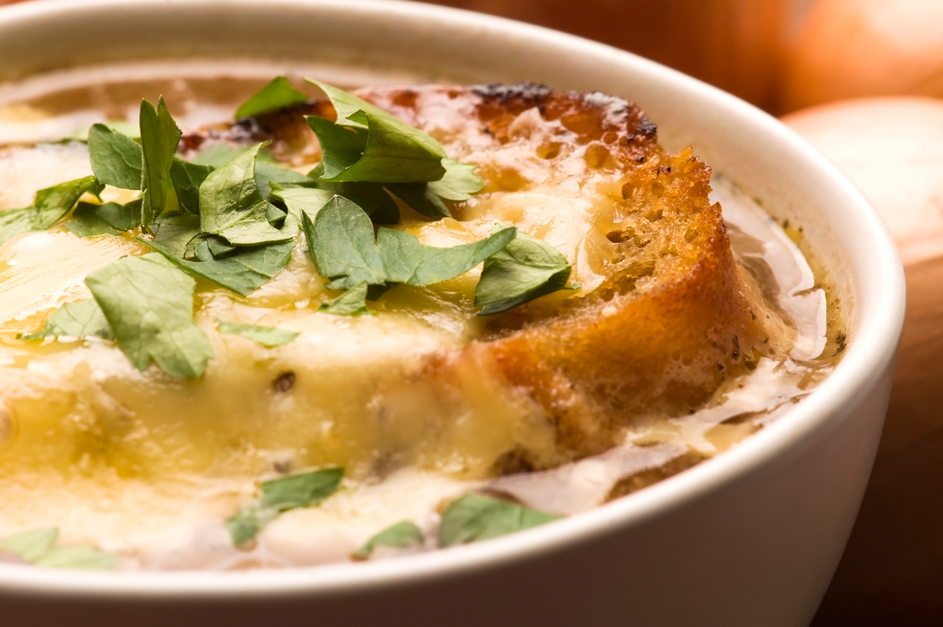 Remove and discard bay leaf and ladle the soup into bowls. Top with dry bread slices and cheeses. Broil 2-3 minutes or until cheese is melted and browned.