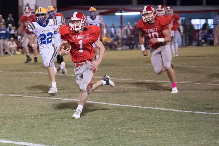 The Rebels struck first in the contest. After driving to the Winona six and turning the ball over on downs, the Rebels got the ball at their own 41. Hunter Brackin then got free on a 59-yard run with 3:09 left in the first quarter. Brennan Blaylock ran in the two-point conversion and Carroll led 8-0.