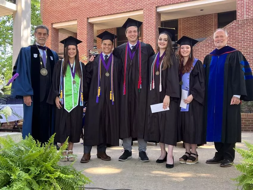 Left to right: Dr. Robert W. Pearigen, president of Millsaps College; Taylor Kay Weintritt; Paul Starnes Thomas; Newlon Bryce Gillihan; Mary Frances Dickie; Anna Grace Boxx; Dr. Keith Dunn, provost and dean of Millsaps College. Photo credit: Greg Campbell