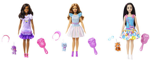 Her fashion is more kid-like, with playful heart, star and flower designs on jammies and flouncy preschool-friendly dresses and swim gear. Her accessories are larger for littler hands, and her hair is extra long for easier brushing.