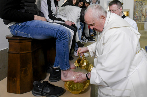 VATICAN CITY (AP) — In a Holy Thursday ritual symbolizing humility, Pope Francis washed and dried the feet of a dozen residents of a Rome juvenile prison, assuring them of their dignity and telling them “any of us” can fall into sin.