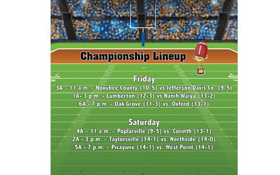 The Mississippi High School Activities Association will crown six football champions Friday and Saturday in games at the University of South Mississippi's M.M. Roberts Stadium in Hattiesburg.