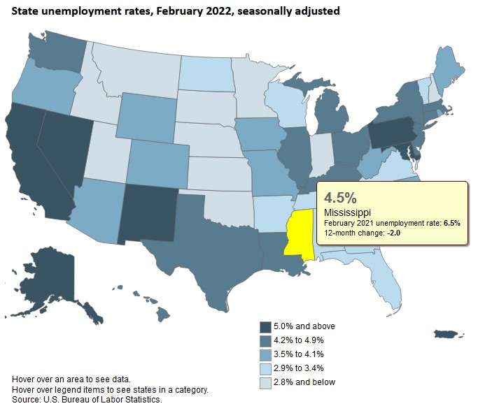 The current unemployment rate for Mississippi (as of February 2022) stands at 4.5 percent.