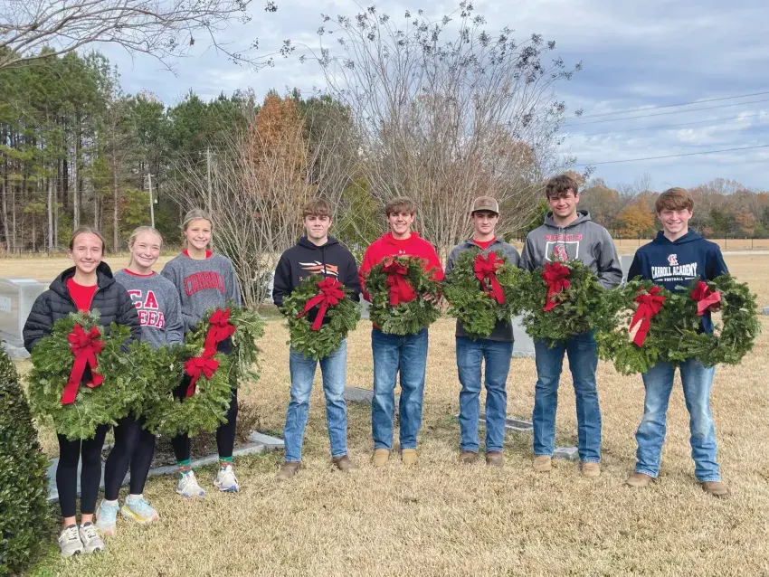 Pictured are Carroll Academy Student Council Members Bailey Daves, Andie Holliday Milton, Nevaeh Wolfe, Layton Alderman, Jack Grones, Reed Thomas, Reid Blaylock and Cole Beckwith helped distribute wreaths to veterans across the cemetery.