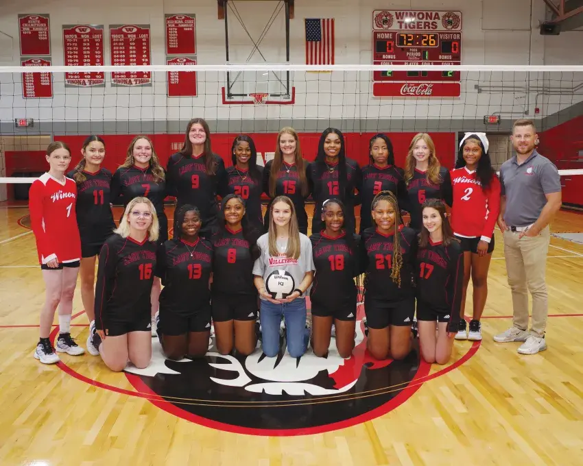 Pictured on row one are, Haley Gilmore, Alisha Taylor, Asia Stinson, Emma Vincent, Jaida Crawford, Diamond Lott, and Kaylee Shirley. Row two, Emily Casiday, Sofia Guzman, Keagan Hall, Mary Beth Brannon, Ariella Jones, Brooklyn Matthews, Jadah Gee, Azaria Small, Eden Leech, Khiylis Mathis, and Coach Gunner Nichols. (Picture by Becky Dees ©2024 Emmerich Newspapers, Inc.)