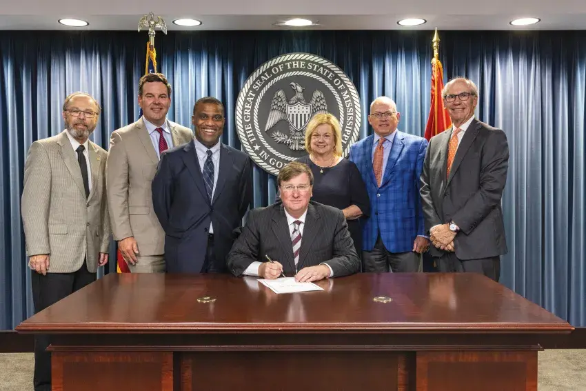 Pictured, from left, Robert Leslie, Manager of Public Affairs for Atmos Mississippi Division, Matt Davidson, president of the Mississippi Division for Atmos, Bobby Morgan, Governor Reeves, Reed Branson, and Joe Sims.