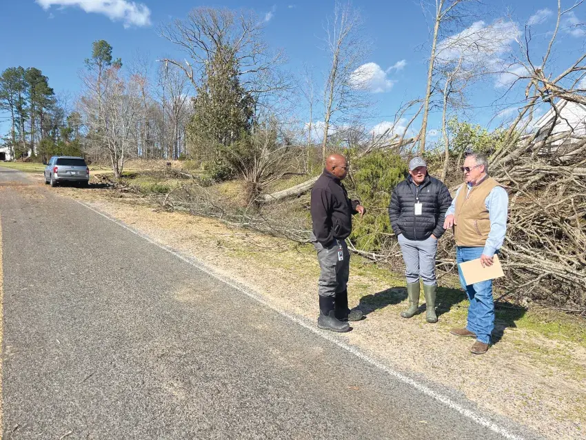 Pictured from left are Mississippi Emergency Management Agency District 3 Coordinator Jason Doyle, MEMA Northern Region Filed Services Supervisor Myrl Williams, and Carroll County Board of Supervisors President Jim Neill assess the damage from the tornado Friday night in the Hickory Grove Community in Northern Carroll County Sunday afternoon. (Photo special to the Times/Conservative)