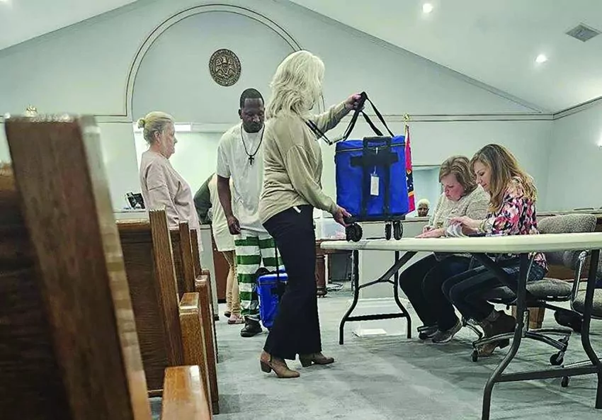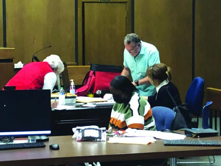 Pictured, clockwise, from left, District 2 Montgomery County Election Commissioner Jeanette Pyron, District 4 Election Commissioner Butch McGlothan and District 3 Election Commissioner Tracy Campbell check in a poll worker, far right, while counting votes at the Montgomery County Courthouse on Tuesday night.