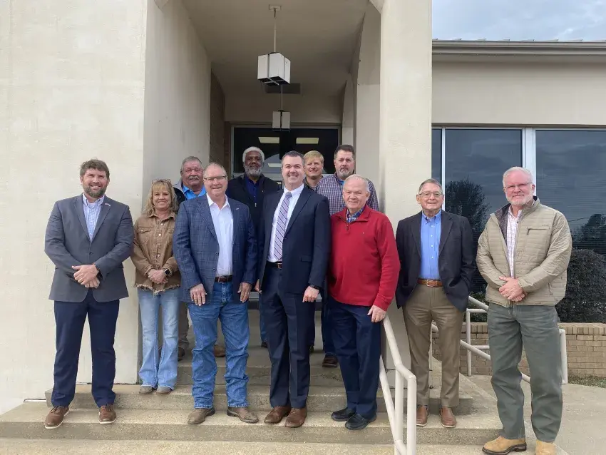 Pictured from the left, back row: Beat 3 Supervisor Dill Tucker, Beat 4 Supervisor Claude Fluker, Beat 2 Supervisor Josh Hurst, Beat 5 Supervisor Randy Browning. Front Row: Chancery Clerk Casey Carpenter, Tax Assessor Tammy Johnson, Beat 1 Supervisor Jim Neill, GLCEDF Executive Director Thomas Gregory, Circuit Clerk Durward Stanton, EDF Board of Directors Member David O'Bryan, and Sheriff Clint Walker.