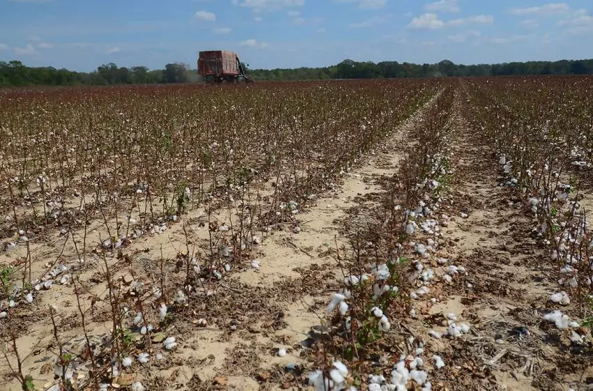 Walter West,Jr., harvests cotton at his farm in rural Hazlehurst, Friday, Sept. 22, 2023. Ordinarily, West's cotton crops would look like a sea of white, but this season's crops have been severely impacted by drought conditions. Credit: Vickie D. King/Mississippi Today