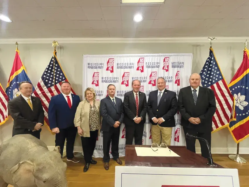Pictured from left, are Representative Karl Oliver, Montgomery County GOP Chairman Matt Bennett, Senator Lydia Chassaniol, Montgomery County District 4 Supervisor Ron Wood, North Carrollton Mayor and Carroll County GOP Chairman Ken Strachan, Carroll County Beat 1 Supervisor Jim Neill, and Montgomery County Beat 1 Supervisor Keith McGee. Not pictured North Carrollton Alderman Mitchell Costilow and North Carrollton Alderman Barbara Sheppard. (Photo special to The Times/Conservative)