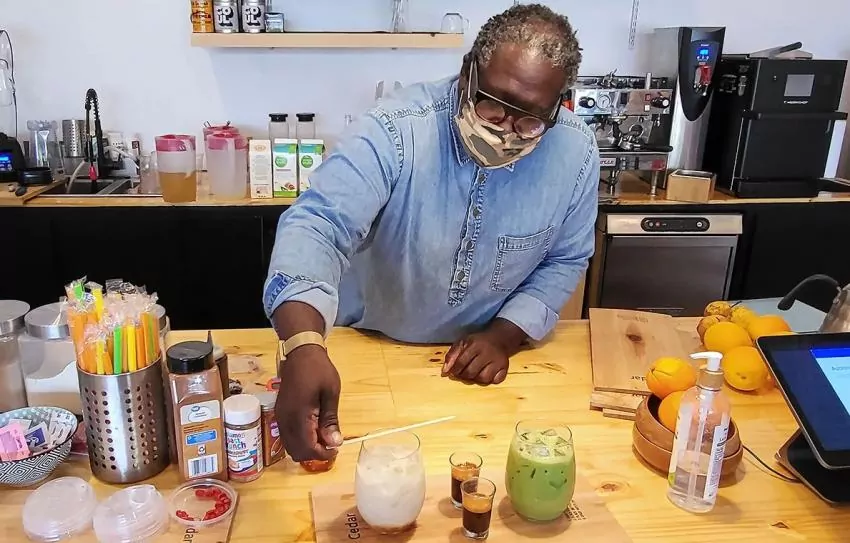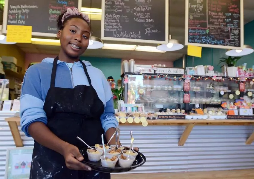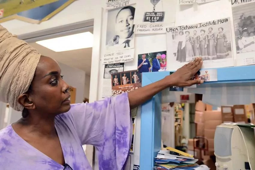 Maati Primm, owner of Marshall’s Music and Bookstore on Farish Street in Jackson, shows a photograph of her grandmother Ora Page Marshall (third from left), and classmates in college, Thursday, Aug. 11, 2022. The business is the oldest Black owned bookstore in the country.