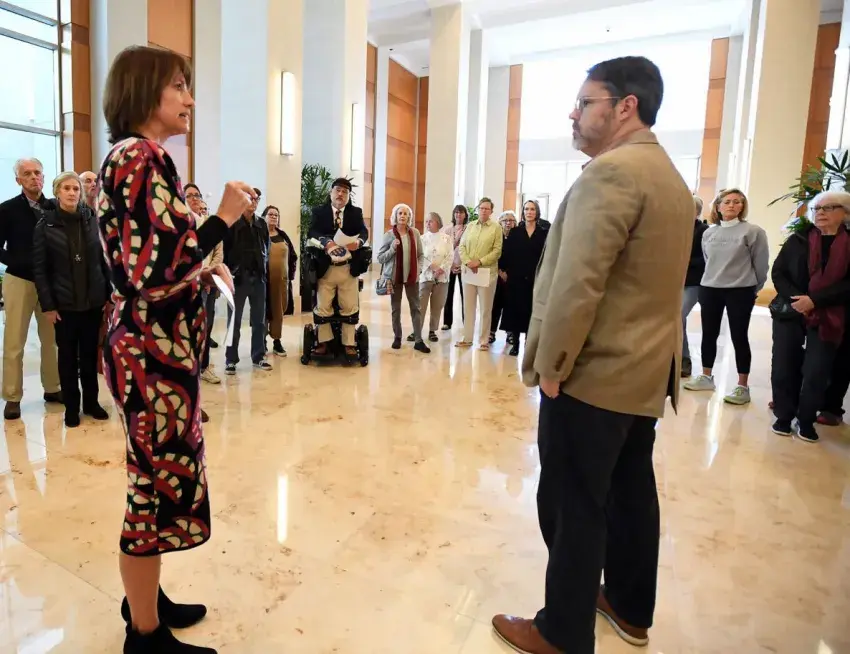 Kathleen O'Beirne, left, and other advocates concerned about the actions of the Trump administration voiced concerns with Thomas Dent, a staffer for Sen. Cindy Hyde-Smith at Hyde-Smith's office in the Pinnacle Building in downtown Jackson, Friday, March 21, 2025. Credit: Vickie D. King/Mississippi Today
