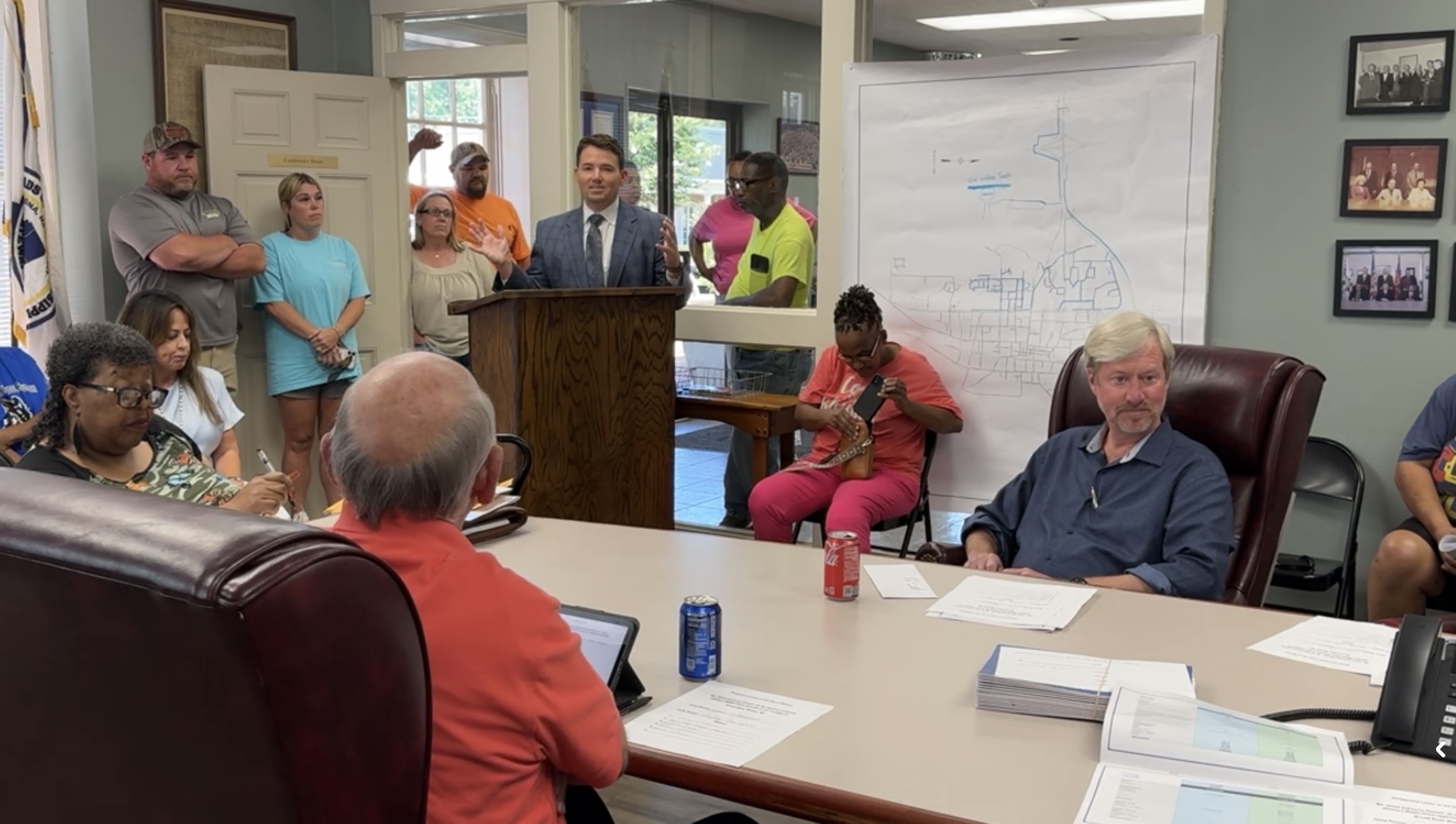 Attorney Ryan Taylor, representing Marty’s Towing, began by providing the Board with a recap of recent events. He explained that owner Mr. Wiggins met with former Mayor Aaron Dees and current code enforcement officer Ricky Johnson about placing a mobile building on the property to serve as an office space for the business.