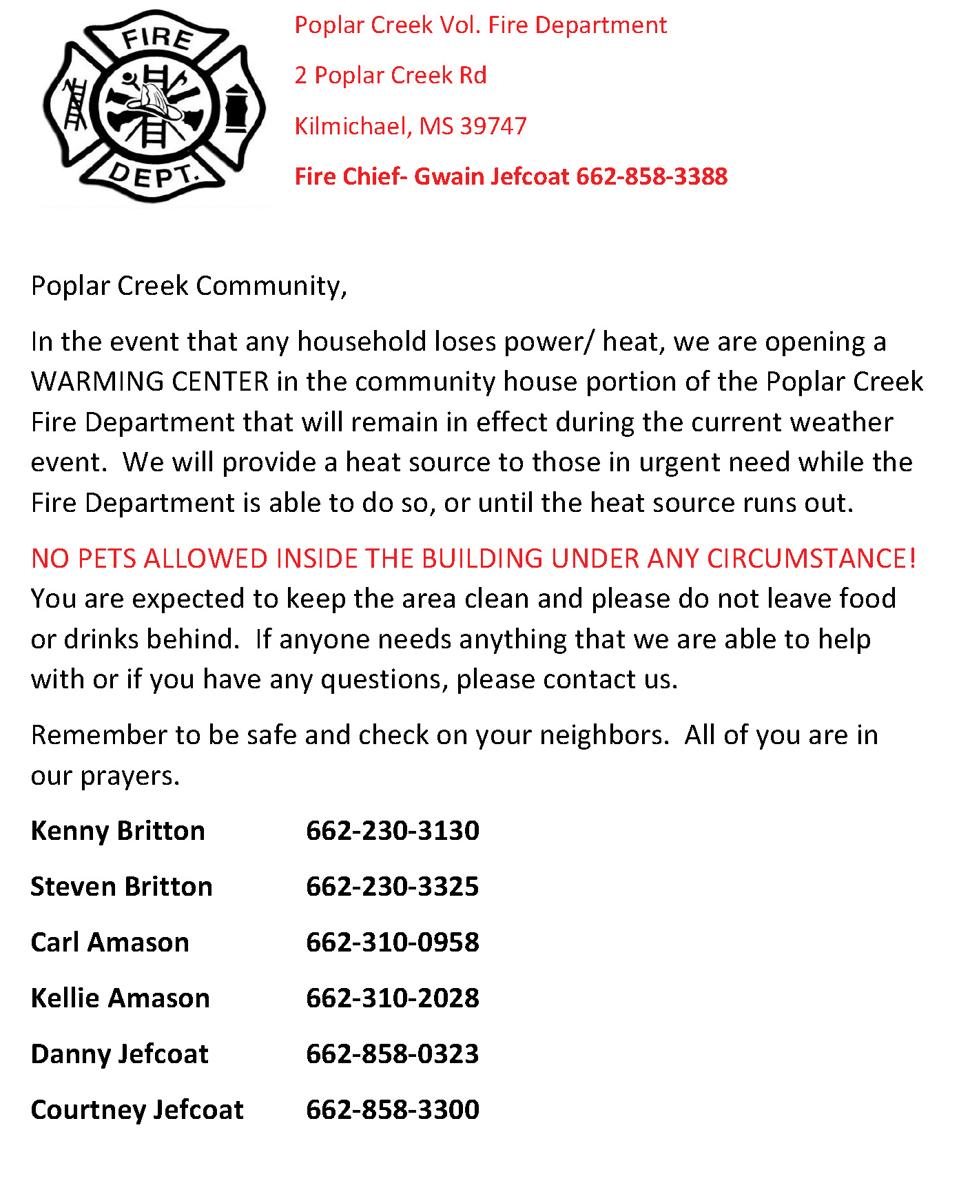 In the event that any household loses power/ heat, we are opening a WARMING CENTER in the community house portion of the Poplar Creek Fire Department that will remain in effect during the current weather event. We will provide a heat source to those in urgent need while the Fire Department is able to do so, or until the heat source runs out.